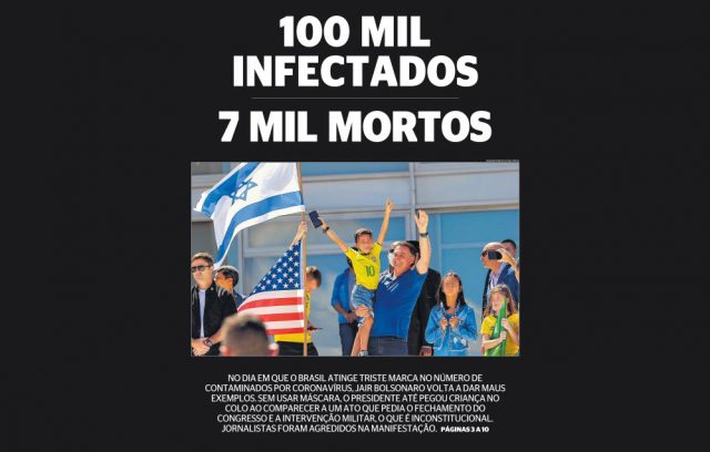 Abaixo, uma foto do presidente da República no ato criminoso de ontem (3), seguida da legenda: “No dia em que o Brasil atinge triste marca no número de contaminados por coronavírus, Jair Bolsonaro volta a dar maus exemplos. Sem usar máscara, o presidente até pegou criança no colo ao comparecer a um ato que pedia o fechamento do Congresso e a intervenção militar, o que é inconstitucional. Jornalistas foram agredidos na manifestação”.