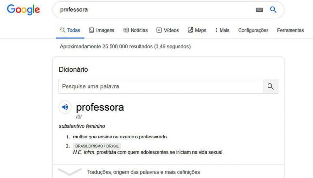 “Prostituta com quem adolescentes se iniciam na vida sexual.” Esta era, até a última quarta-feira, uma das definições que apareciam para a palavra “professora” quando um usuário do Google procurava seu significado no serviço de busca. O conceito, apresentado como um “brasileirismo” – expressão utilizada informalmente, sobretudo na região Nordeste –, viralizou nas redes sociais e levantou debates sobre machismo atrelado a uma depreciação às mulheres que lecionam, já que a definição do termo sob o gênero masculino de “professor” exibe apenas as acepções de “aquele que professa uma crença” e “aquele que ensina”.