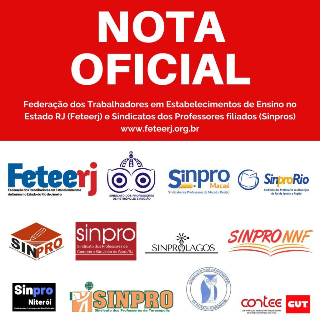 Nós, profissionais da educação dos estabelecimentos de ensino privado e públicos, reafirmamos nosso compromisso com a população fluminense, não apenas no desenvolvimento de alternativas para o ensino não presencial, mas também alertando que no estágio atual de maior descontrole da pandemia do covid-19, não é o momento de reabrir as escolas! As novas cepas são mais contagiantes e estão atingindo cada vez mais adolescentes e crianças. Fazemos um chamado à sociedade para juntos vencermos este momento tão difícil de nossa história. União, estado e municípios precisam auxiliar, de forma digna, as pessoas com maior vulnerabilidade social e precisam garantir um isolamento social realmente eficaz para superarmos, o quanto antes, esta situação caótica em que vivemos.