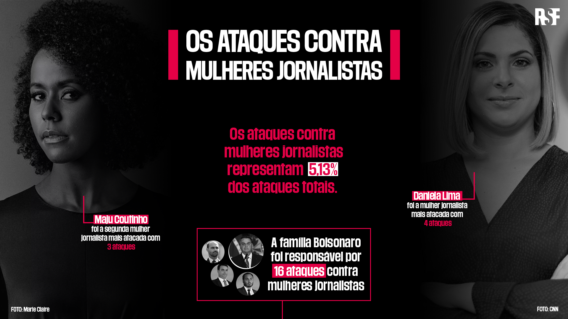 As jornalistas mulheres, assim como em 2020, permanecem em 2021 como vítimas do machismo primário e grosseiro da família Bolsonaro (concentram 6,1% dos ataques do presidente e seus três filhos). Em 2 de junho, o presidente qualificou Daniela Lima, apresentadora da CNN Brasil e alvo preferencial de seus ataques, de quadrúpede, causando uma avalanche de ataques misóginos e abjetos contra a jornalista nas redes sociais. Em 31 de março, a jornalista Marla Bermuda, da TV Vitória, foi alvo de uma campanha de difamação e recebeu ameaças de morte depois que a deputada federal Carla Zambelli, fiel apoiadora de Jair Bolsonaro, a acusou de “manipulação” e de “transformar cemitérios em estúdios de gravação” em um vídeo.