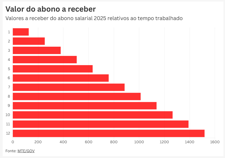 O valor do abono varia entre R$ 127,00 e R$ 1.518,00, conforme a quantidade de meses trabalhados em 2023. O cálculo é proporcional ao tempo de serviço no ano-base (2023), sendo que apenas quem trabalhou os 12 meses recebe o valor total de um salário mínimo.