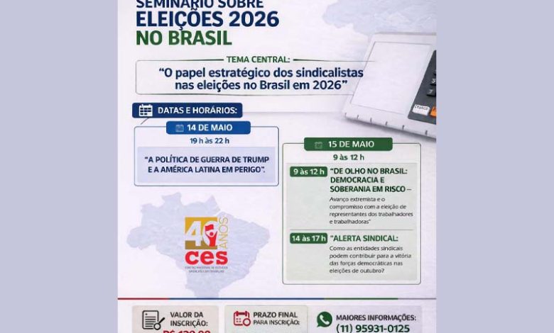 Nos dias 14 e 15 de maio — sendo, no dia 14, das 19h às 22h, e no dia 15, das 9h às 12h e das 14h às 17h, será realizado, de forma remota, o Seminário sobre Eleições 2026 no Brasil, com o tema central: “O papel estratégico dos sindicalistas nas eleições no Brasil em 2026”.
