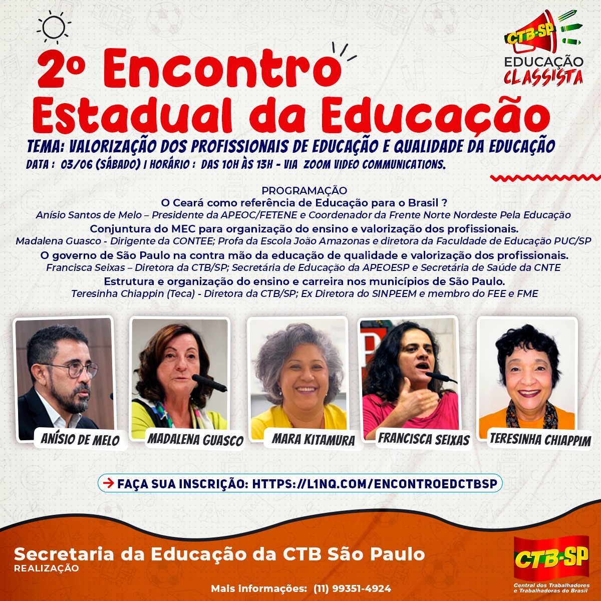 A Central dos Trabalhadores Trabalhadoras do Brasil de São Paulo (CTB-SP), informa que estão abertas as inscrições para o 2º Encontro Estadual da Educação, que este ano abordará o tema “Valorização dos Profissionais de Educação e Qualidade da Educação”. O evento será em formato virtual, no dia 03 de junho (sábado), das 10h às 13h.