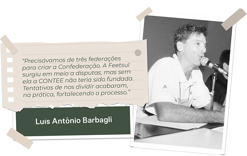 À época, a legislação sindical impunha requisitos formais para a criação de uma confederação. Ao recordar o esforço para atender a essas exigências, Luís Antônio destacou que “Precisávamos de três federações para criar a Confederação. A Feetsul surgiu em meio a disputas, mas sem ela a CONTEE não teria sido fundada. Tentativas de nos dividir acabaram, na prática, fortalecendo o processo.”