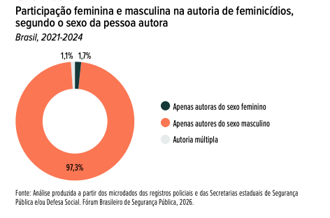 Além disso, destaca que “a quase exclusividade masculina na autoria indica que estamos diante de uma forma de violência vinculada a padrões de masculinidade que associam poder, controle e posse à identidade masculina”.