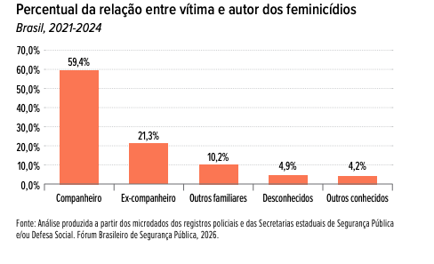 O relatório ainda acrescenta que diferentemente do que se observa na maioria das mortes violentas de homens — frequentemente associadas a conflitos interpessoais, disputas criminais ou violência urbana de modo geral —, “o feminicídio expressa uma assimetria de gênero sistemática: homens matando mulheres com quem mantêm ou mantiveram vínculos íntimos, em contextos nos quais a autonomia feminina é percebida como ameaça à autoridade masculina”.