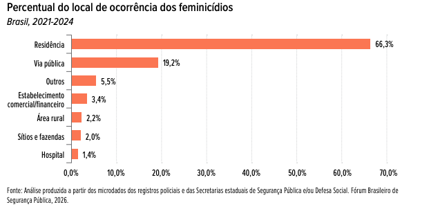 Voltando aos dados do relatório, ao analisar 5.729 registros de feminicídio ocorridos entre 2021 e 2024, o FBSP chegou à conclusão de que 66,3% dos feminicídio ocorreram nas casas das próprias vítimas — locais onde essas mulheres deveriam estar mais seguras — contra 19,2% em vias públicas.