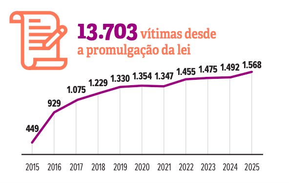 Somente em 2025, foram 1.568 casos, o maior número desde 2015, quando passou a vigorar a lei que tipifica esse crime; 80% foram cometidos por parceiros ou ex-parceiros íntimos