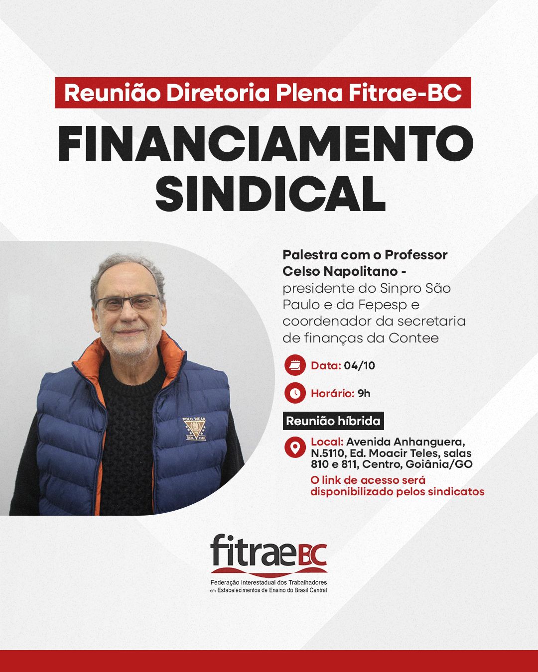 O coordenador da Secretaria de Finanças da Confederação Nacional dos Trabalhadores em Estabelecimentos de Ensino (Contee), Celso Napolitano, ministrará palestra sobre o financiamento sindical durante a Reunião de Diretoria Plena da Fitrae-BC, que ocorrerá às 9h do dia 4 de outubro. O encontro será realizado em formato híbrido, permitindo participação presencial e remota.