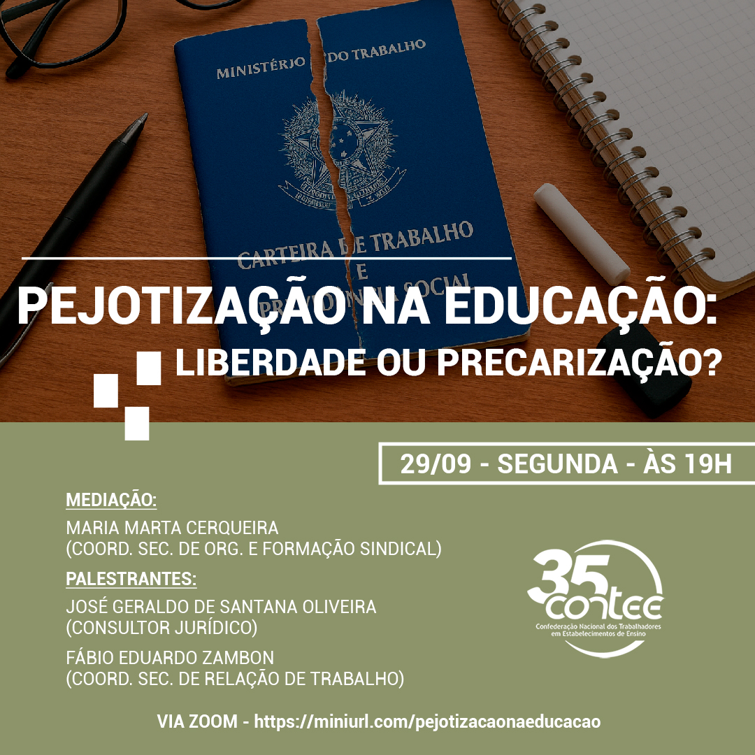 A Confederação Nacional dos Trabalhadores em Estabelecimentos de Ensino (Contee) realizará, na próxima segunda-feira (29), às 19h, pela plataforma Zoom, a live “Pejotização na Educação: Liberdade ou Precarização?”. O evento é uma iniciativa das secretarias de Organização e Formação Sindical e de Relações do Trabalho.