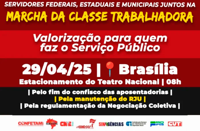 Na próxima terça-feira (29), servidores públicos das três esferas – municipal, estadual e federal – de todo o país, participarão em Brasília da 2ª Marcha Nacional da Classe Trabalhadora, organizada pela Central Única dos Trabalhadores (CUT) e demais centrais sindicais.