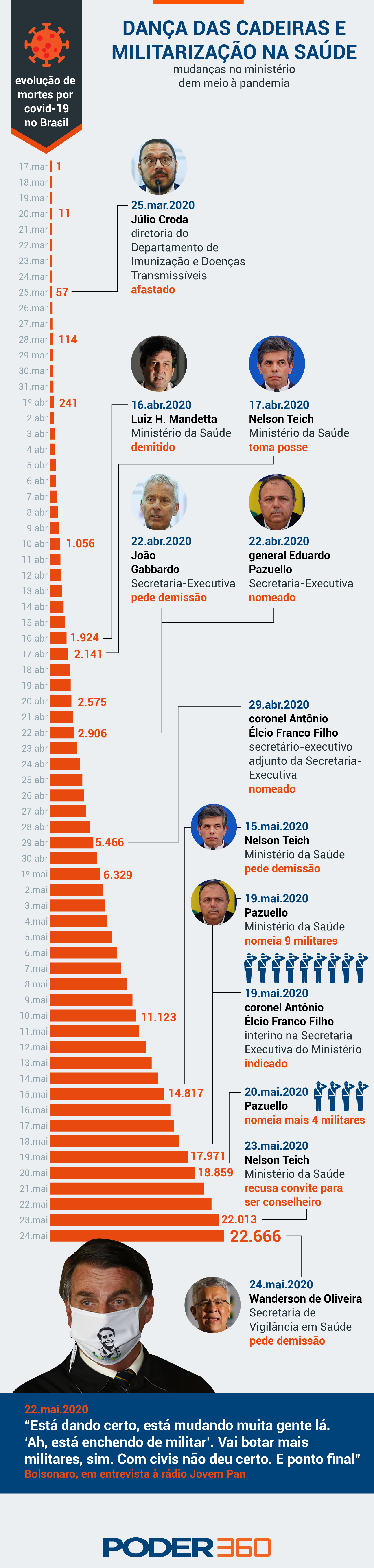 Também houve uma militarização no Ministério da Saúde, depois de o general Eduardo Pazuello assumir interinamente o comando da pasta, em 15 de maio, com a saída de Nelson Teich do cargo.