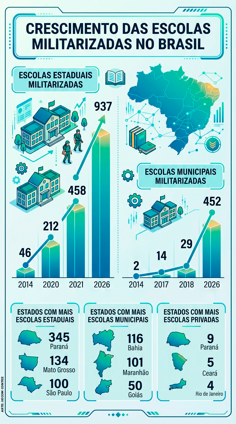 O número de escolas militarizadas cresceu 28,9 vezes de 2014 a 2026 no Brasil. É o que mostra o levantamento do professor Fernando Cássio, da Faculdade de Educação da USP (Universidade de São Paulo). Em 2014, eram 48 as escolas nesse modelo. Doze anos depois, o país chega a 1.389 unidades – em âmbito estadual e municipal.