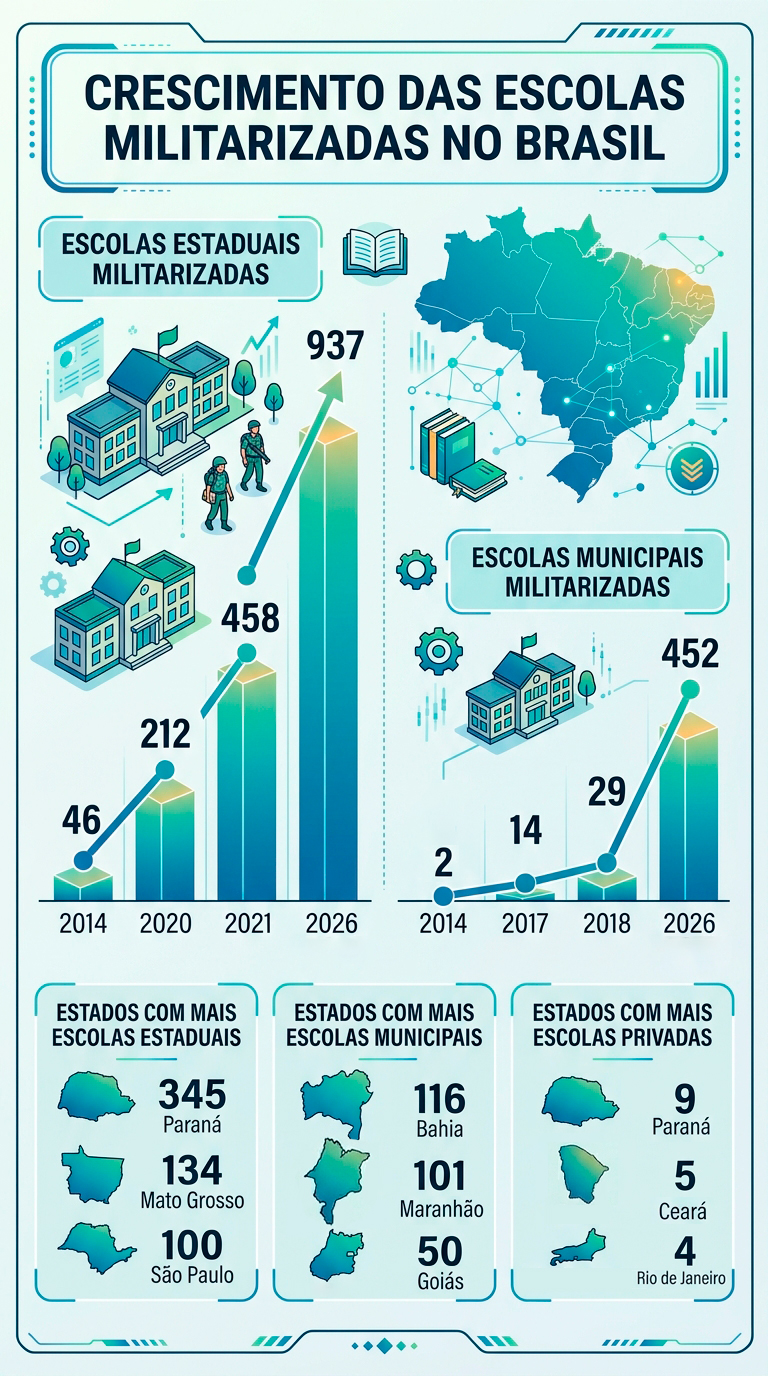 O número de escolas militarizadas cresceu 28,9 vezes de 2014 a 2026 no Brasil. É o que mostra o levantamento do professor Fernando Cássio, da Faculdade de Educação da USP (Universidade de São Paulo). Em 2014, eram 48 as escolas nesse modelo. Doze anos depois, o país chega a 1.389 unidades – em âmbito estadual e municipal.