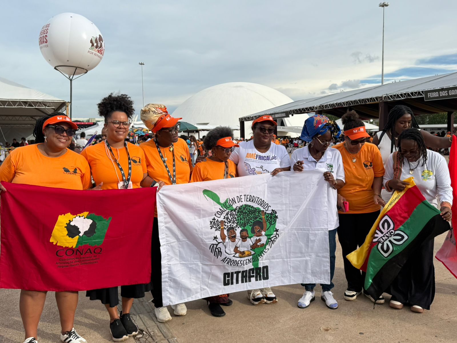 A marcha também foi território de afirmação quilombola. Centenas de mulheres quilombolas reivindicaram seus direitos territoriais e denunciaram o racismo estrutural que ameaça suas comunidades.