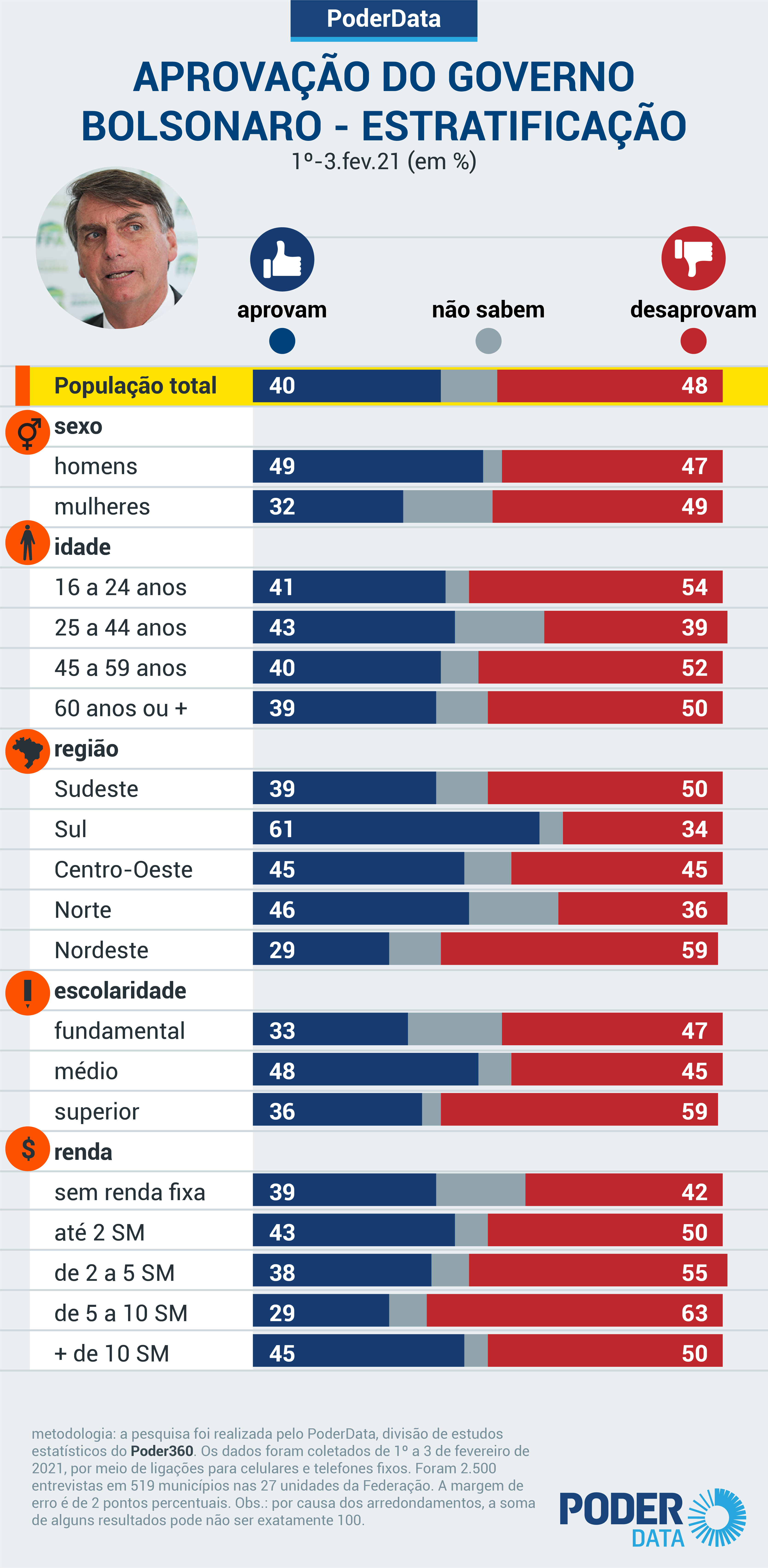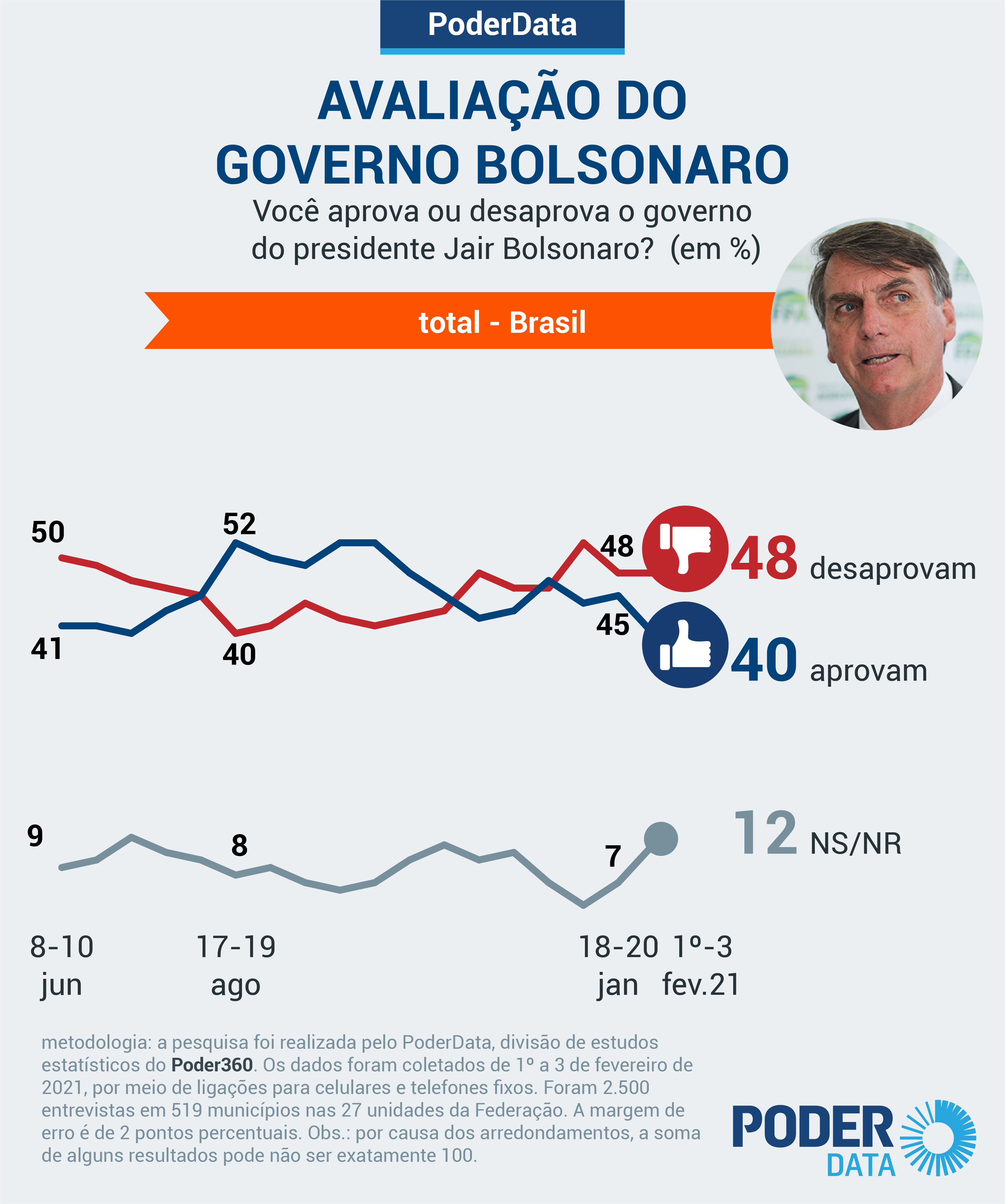 Com a vacinação ainda em rimo lento, o repique de casos e mortes por covid-19 no Brasil e o fim do auxílio emergencial, a aprovação ao governo do presidente Jair Bolsonaro caiu 5 pontos percentuais em 15 dias e chegou a 40%, mostra pesquisa PoderData realizada de 1º a 3 de fevereiro de 2021.