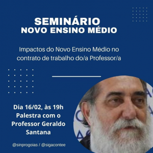 A Contee e o Sinpro Goiás realizam nesta quarta-feira, 16, às 19h, o seminário “Impactos do novo ensino médio no Contrato de Trabalho do/a professor/a”, com a participação do consultor jurídico José Geraldo de Santana Oliveira.