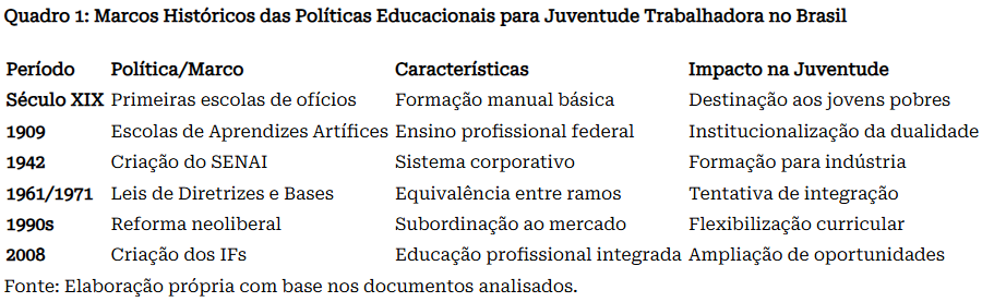 A análise das trajetórias juvenis brasileiras na transição entre educação e trabalho revela a persistência de padrões estruturais que atravessam períodos históricos distintos, caracterizados pela subordinação das necessidades educacionais dos jovens das classes populares às demandas imediatas de mão-de-obra