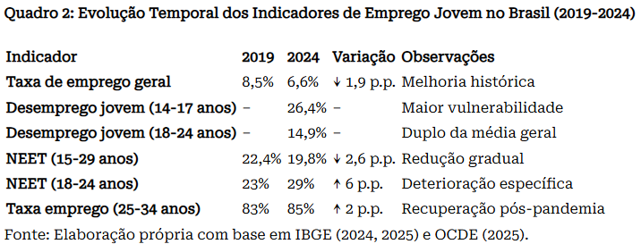 Os dados mais recentes sobre emprego jovem no Brasil revelam uma situação paradoxal: enquanto a taxa de desemprego geral atingiu níveis históricos baixos em 2024 (6,6%), as taxas de desemprego juvenil permanecem significativamente elevadas, especialmente entre jovens de 14-17 anos (26,4%) e 18-24 anos (14,9%), segundo dados da PNAD Contínua do primeiro trimestre de 2025 (IBGE, 2025). Os dados internacionais da OCDE (2025) complementam essa análise, demonstrando que a taxa de emprego para jovens adultos de 25-34 anos no Brasil
