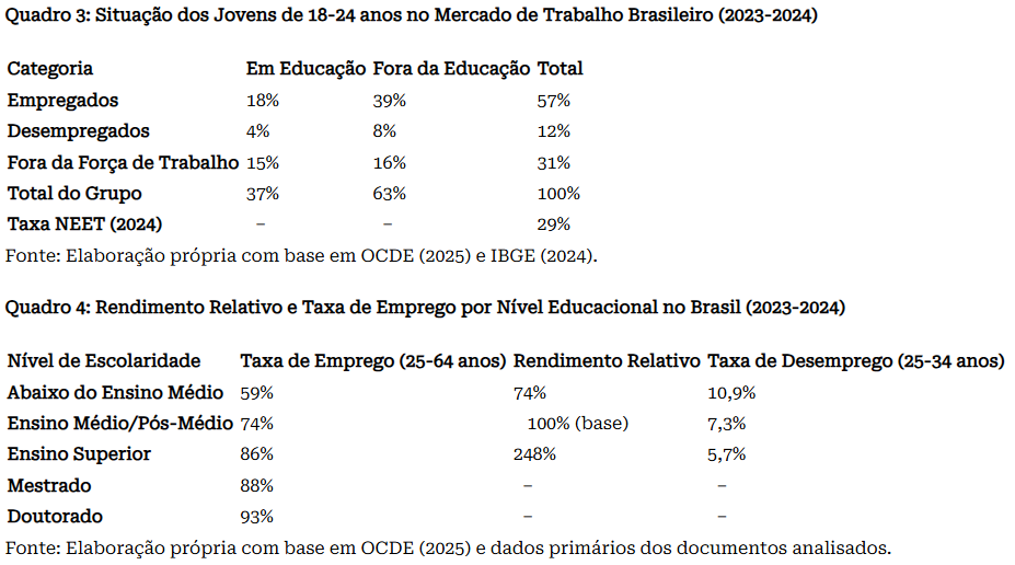 Os dados do IBGE sobre educação e trabalho juvenil revelam que, dos 48,5 milhões de jovens de 15-29 anos, apenas 15,3% conseguem conciliar trabalho e estudo, enquanto 39,4% trabalham sem estudar e 19,8% não trabalham nem estudam, evidenciando as dificuldades para compatibilizar essas duas dimensões fundamentais da vida juvenil (IBGE, 2024). A análise comparativa com dados da OCDE (2025) demonstra que entre jovens de 18-24 anos no Brasil, 37% estavam em educação (18% empregados, 4% desempregados, 15% fora da força de trabalho) e 63% fora da educação (39% empregados, 8% desempregados, 16% fora da força de trabalho). A análise das causas de abandono escolar entre jovens de 14-29 anos identifica a necessidade de trabalhar como principal motivo para homens (53,4%), enquanto para mulheres as razões se dividem entre trabalho (25,5%) e gravidez (23,1%), demonstrando como as desigualdades de gênero se articulam com as pressões econômicas para determinar as trajetórias educacionais e profissionais dos jovens brasileiros.